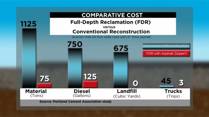 The bottom line? Asphalt recycling with full-depth reclamation has important environmental benefits and can significantly stretch your road repair budget. It also stabilizes your roads, leading to fewer future repairs.