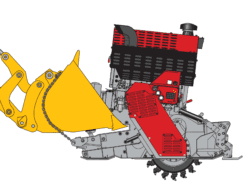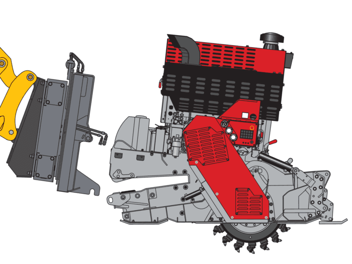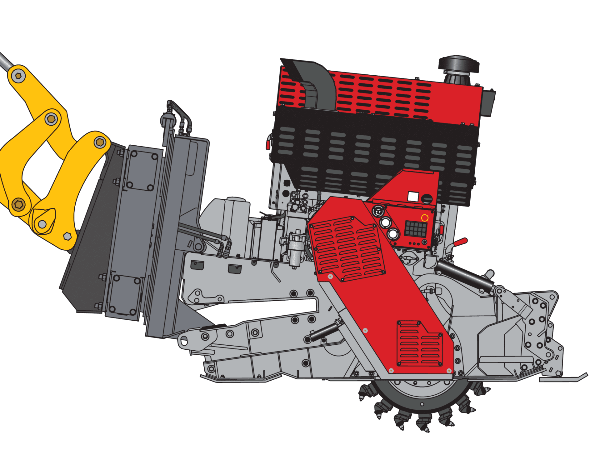 Tilts right or left up to 9° for grinding angled road surfaces. Shifts up to 36″ for accurate curb milling. All three functions are hydraulically controlled.