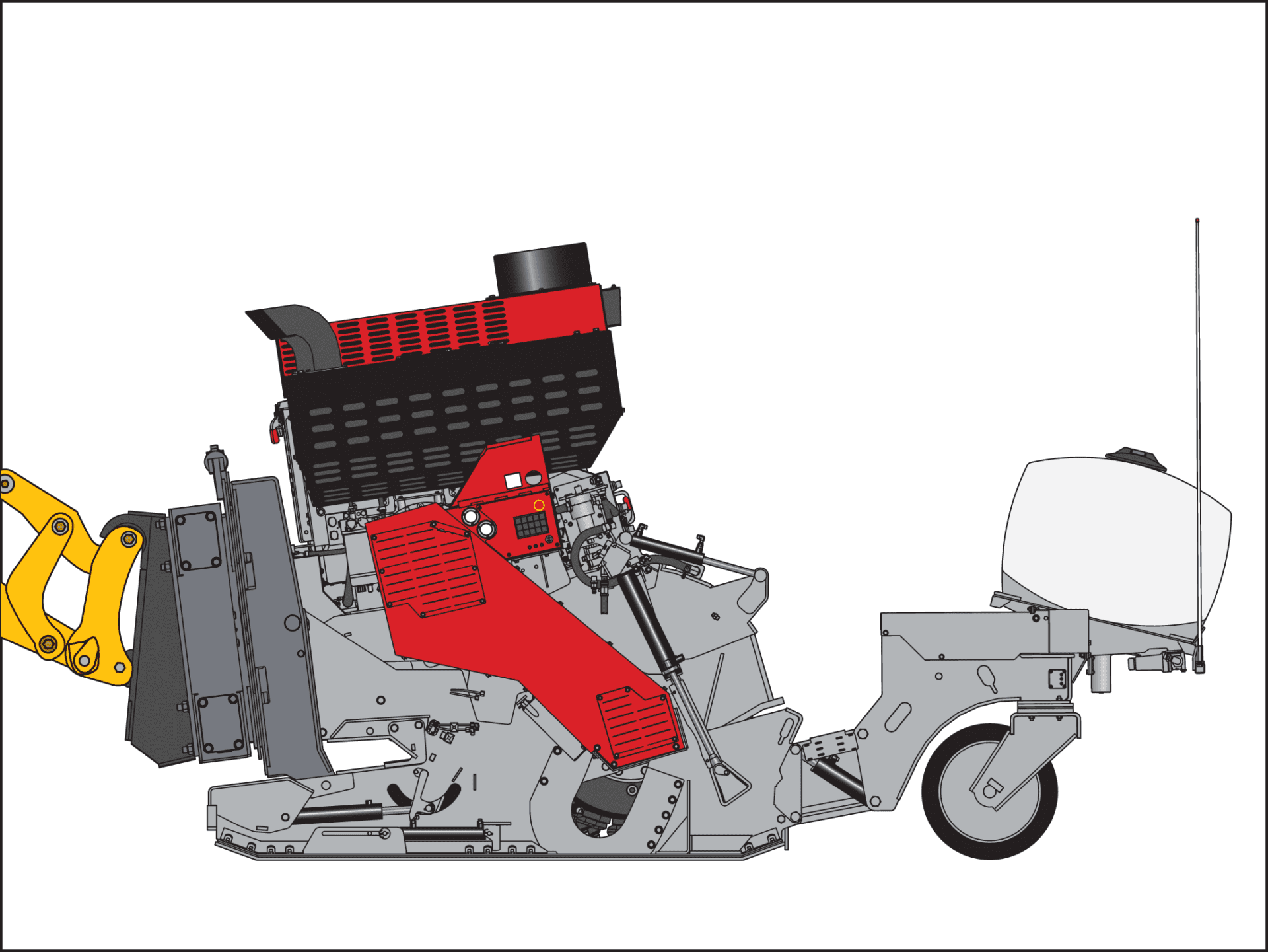 Tilts right or left up to 9° for grinding angled road surfaces. Shifts up to 36″ for accurate curb milling. All three functions are hydraulically controlled.