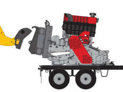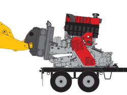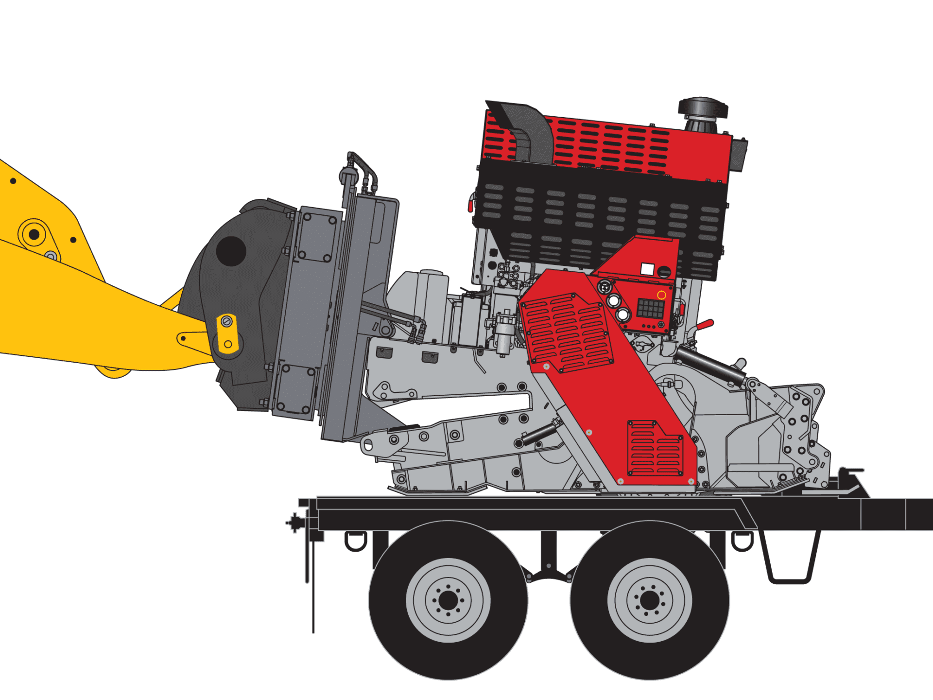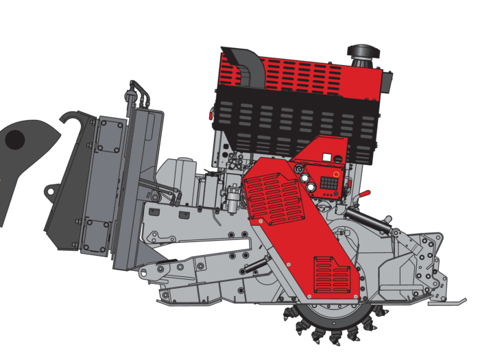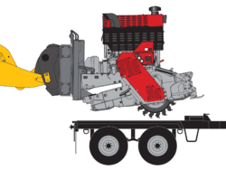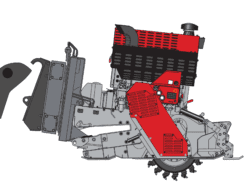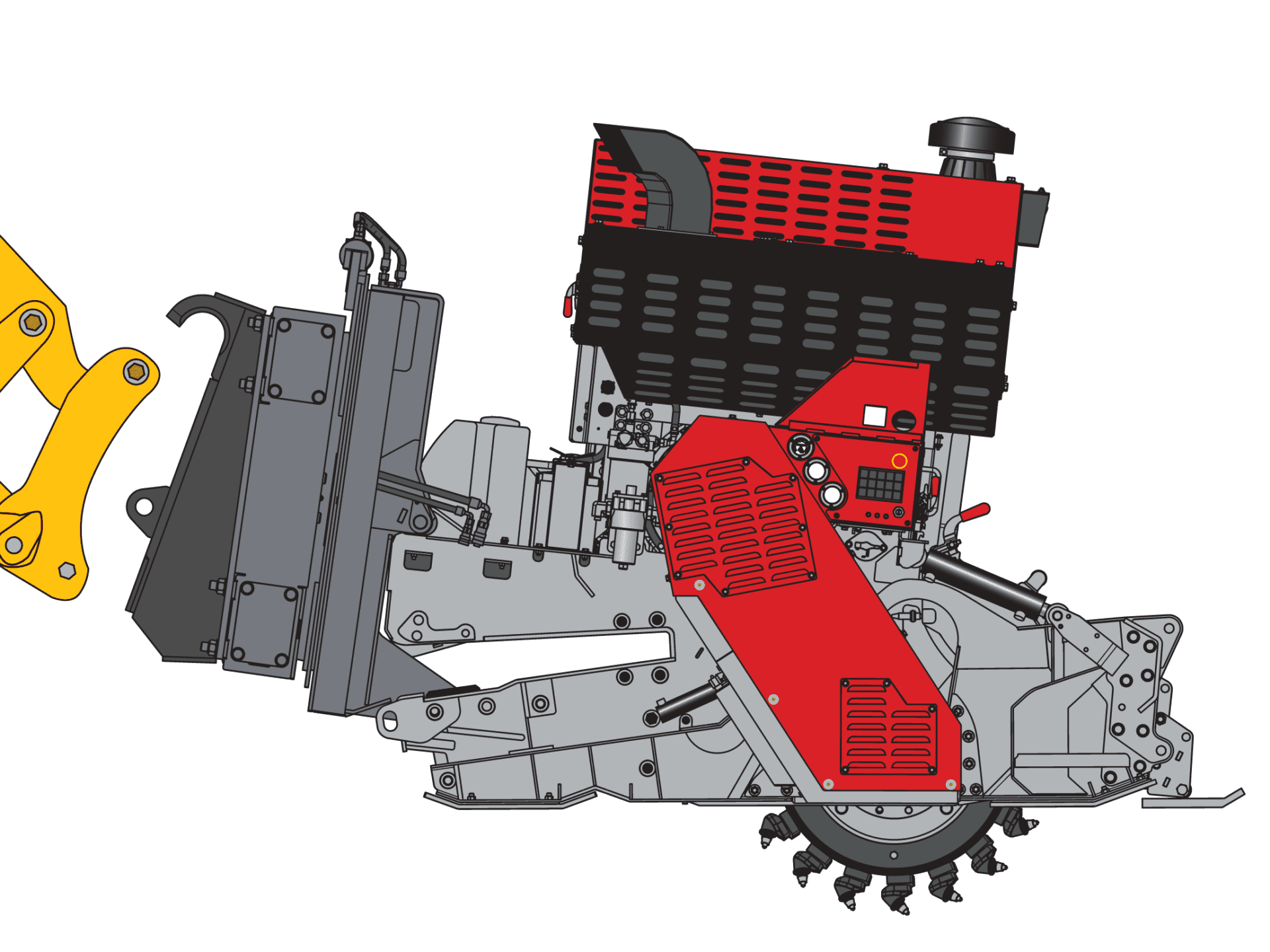 Tilts right or left up to 9° for grinding angled road surfaces. Shifts up to 36″ for accurate curb milling. All three functions are hydraulically controlled.