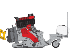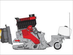 Tilts right or left up to 9° for grinding angled road surfaces. Shifts up to 36″ for accurate curb milling. All three functions are hydraulically controlled.