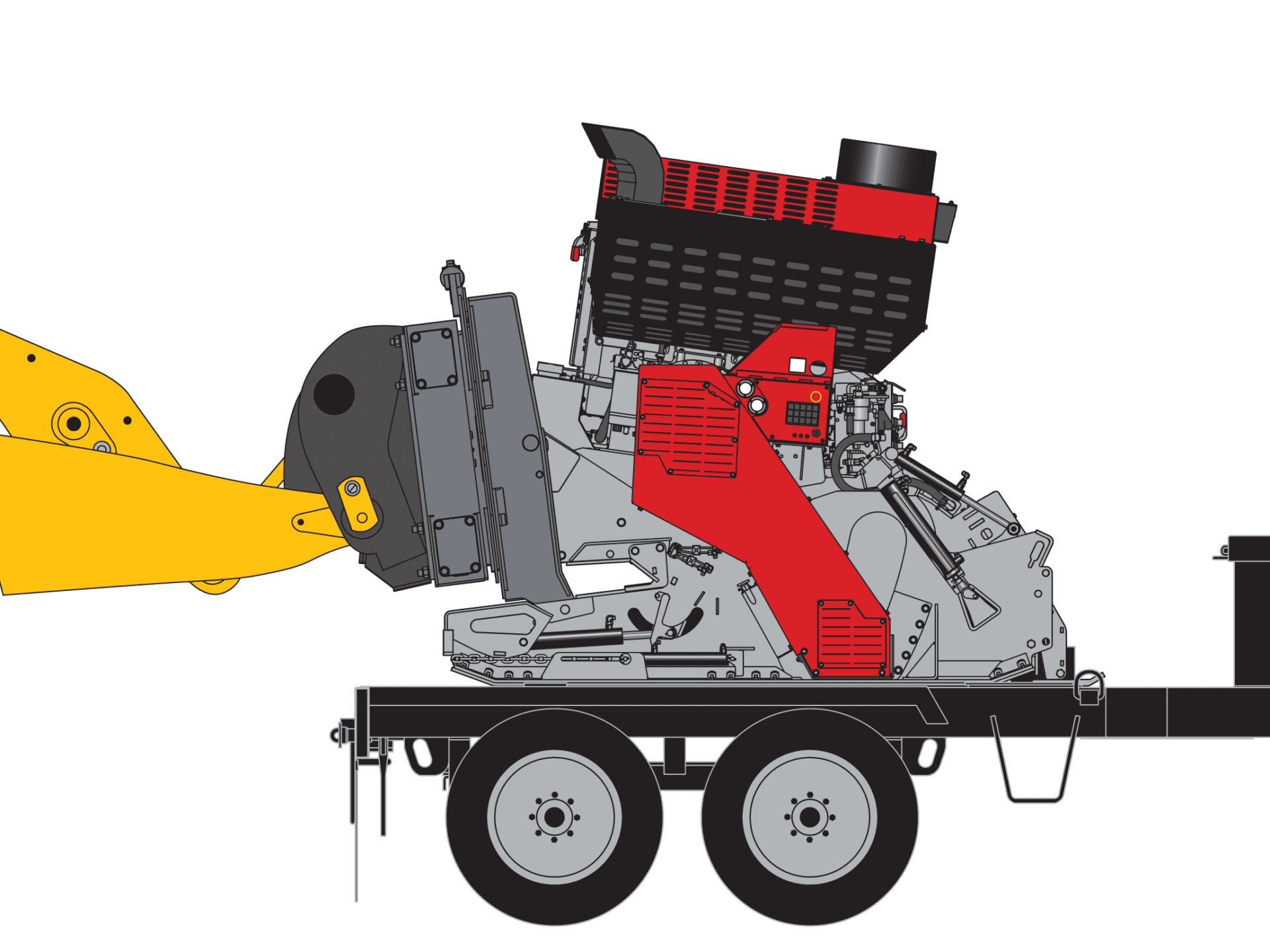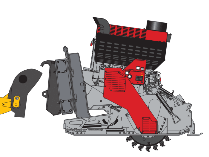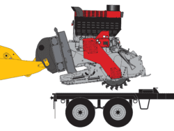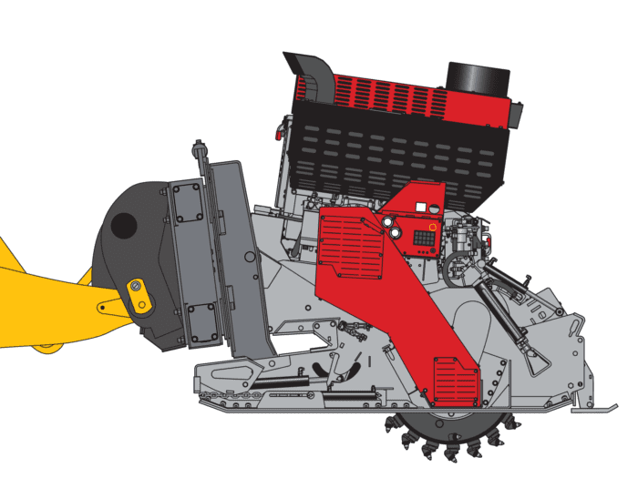 Tilts right or left up to 9° for grinding angled road surfaces. Shifts up to 36″ for accurate curb milling. All three functions are hydraulically controlled.